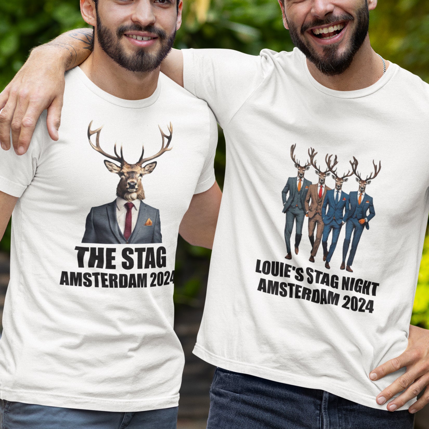 The Groom wears the Stag T Shirt and the rest of the pack wear the design with the Stags wearing suits, all of which can be personalised.